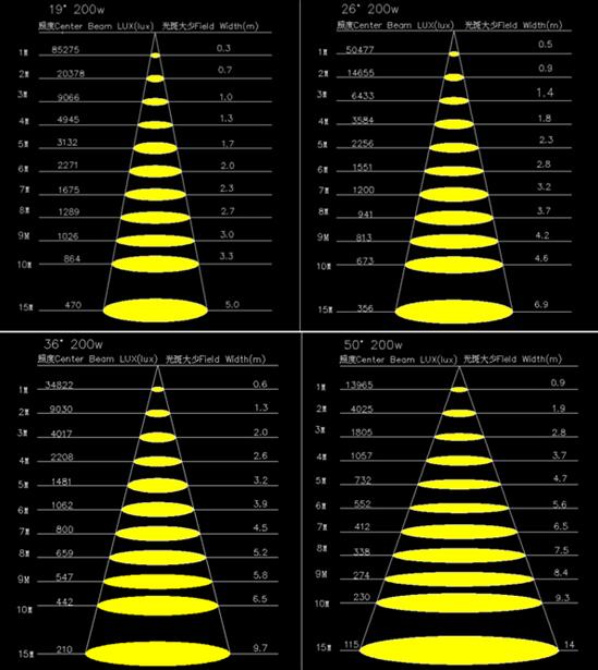 对于我们的LED灯,我们有4种透镜可供选择:19/26/36/50度。它适用于ETC(4镜头),您可以使用ETC前端的镜头或整个镜头替换我们的光源。当然,大多数定制品在不同距离测试时都会想要了解不同程度的流明。别担心,我们已经对它们进行过测试并为您做好准备。在右侧展示你: